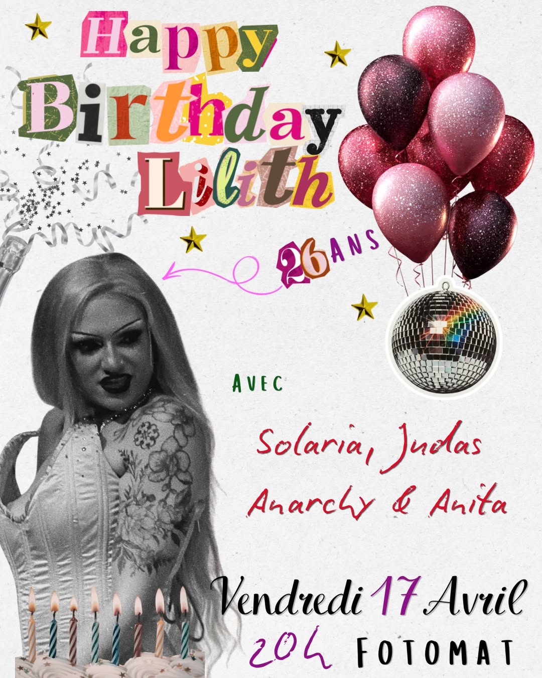 Je suis si excitée à l’idée de fêter mon anniversaire, et avec VOUS! Pour la première fois en huit ans de drag, j’ai l’occasion d’en faire un show le jour J, alors pour le fêter dignement, j’ai invité les copaines pour un show 100% clermontois