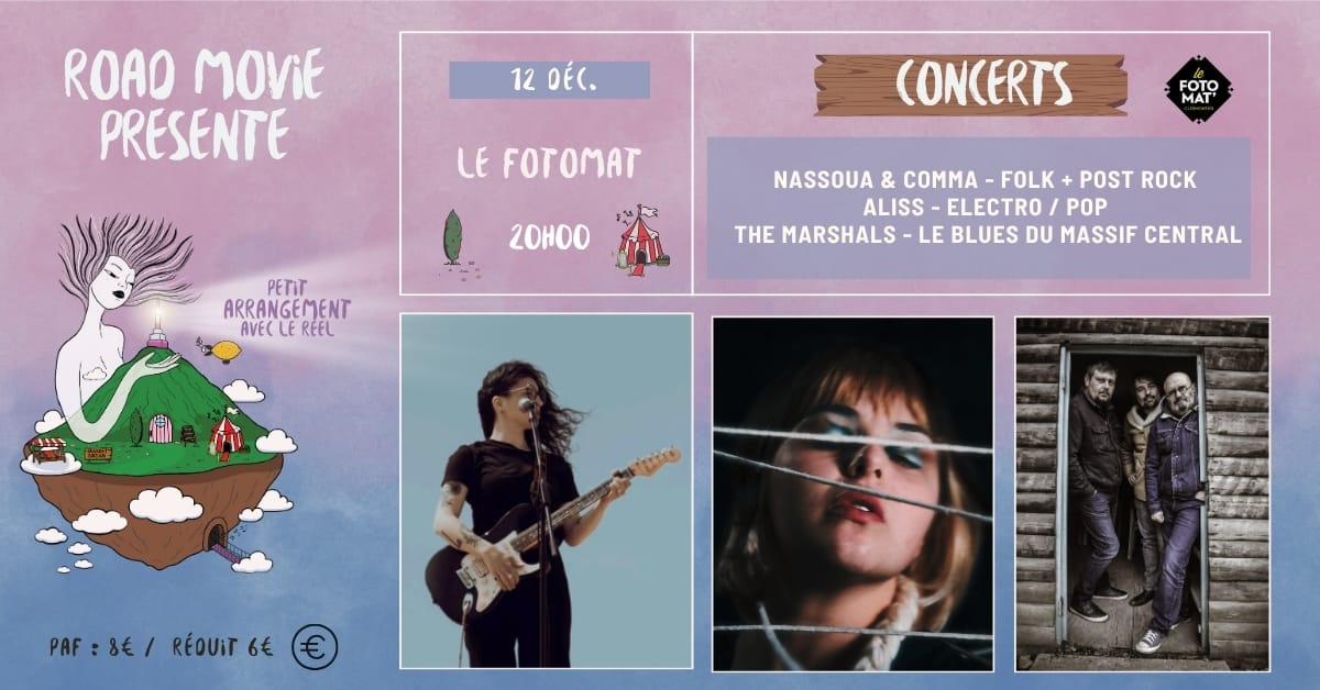 L'association ROAD MOVIE présente dans le cadre de son festival et en partenariat avec LE FOTOMAT une superbe soirée musicale le 12 décembre avec Nassoua & Comma (folk rock) , Aliss (Electro-pop), The Marshals (blues) une très belle soirée avec de super musiciens pour bien finir avant les fêtes de fin d'année.